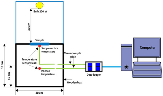 Figure 2 depicts the arrangement utilized for conducting the heating/cooling thermal cycle test, where the thermal efficiency of a specimen was evaluated. The heating setup had wooden box with a 200-watt bulb mounted at the top, a wooden box with aluminum foil reflected paper coated inside and outside of the wooden box, and a computer recording system connected with a data logger. In this test, a 200-watt bulb was used as the heating source, and the duration of the heating process was 160 min; after heating, the heat source was switched off and specimens were naturally allowed to cool down for another 75 min at room temperature. Each specimen was subjected to six thermal cycles. During this process, sample, surface temperature, and inner air temperature were calculated.