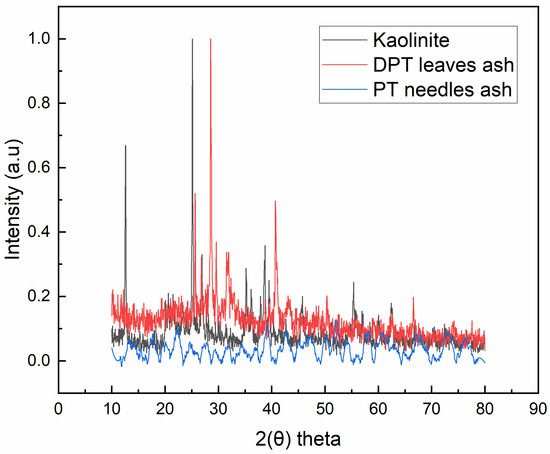 Kaolinite is a clay mineral with a well-known crystalline structure. Figure 3 shows kaolinite has distinct sharp peaks, particularly between 20° and 40° 2θ, indicating a high degree of crystallinity. These peaks correspond to their layered silicate structure. DPT leaf ash and PT needle ash both show sharp peaks. The presence of these sharp peaks suggests that there are crystalline phases within the ash, and it is possible to assess their potential for use in ceramics production.