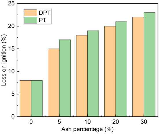 Weight loss upon ignition increases when pore-inducing agents are added. The incorporation of a component (whether organic or otherwise) into the clay blend leads to the development of porosity within the system during the drying and firing stages, facilitated by processes such as dihydroxylation and carbonate decomposition. The formation of voids results in a decrease in weight, as air is lighter than both the clay material and the pore-forming agents. Moreover, it stimulates the densification of the material, which could influence the compressive properties of the fired specimens, potentially compromising their structural stability [24]. Figure 4 represents the average result of five specimens with standard deviations (SDs) for DPT and PT of 0.5 and 0.4. The result reveals that by increasing the ash percentage of date palm tree (DPT) to 5, 10, 20, and 30% the loss on ignition of the tiles increases to 6.6, 13.8, 16.4, and 19.6%, respectively. In the same way, when increasing the ash percentage of pine trees (PTs) to 5, 10, 20, and 30%, the Loss on Ignition of the tiles increased to 15.9, 19.6, 20.2, and 22.1%. The DPT specimen showed a steady increase in weight loss, which indicates the presence of a consistent level of organic material and pore-inducing potential. On the other hand, PT ash causes higher weight loss, which suggests that it contains a greater portion of volatile components or more effective pore-forming substances.