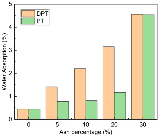 Ceramics tiles are categorized by water absorption rate, with impervious (extremely dense) having a water absorption rate of less than 0.5%, vitreous (high density) having a water absorption rate between 0.5 and 3%, semi-vitreous (medium density) having water absorption rate between 3 and 7%, and non-vitreous (low density) having a water absorption rate greater than 7%. The tested specimen shows a steep rise in water absorption rate when DPT leaves and PT needles were used as secondary additives. The water absorption for the baseline case was observed to be less than 0.5%. All fired specimens had water absorption rates between 0.5% and 7%. Figure 5 represents the average result of the five specimens with a standard deviation for DPT and PT of 0.3. The result reveals that by increasing the ash percentage of date palm trees (DPTs) to 5, 10, 20, and 30%, the water absorption of the tiles increases to 1.4, 2.2, 3.1, and 4.5%, respectively. When the pine tree leaf ash increases to 5, 10, 20, and 30%, the water absorption of tiles increases to 0.7, 0.8, 1.1, and 4.5%, respectively. The introduction of DPT ash and PT needle ash into the ceramic specimens was observed to cause a rise in the water absorption rate as the additive percentage increased. It can be analyzed from the results that as the ash percentage increases, more organic decomposable materials are introduced, which upon firing, leave behind voids creating pathways for water to infiltrate that enable the material to retain the water in it. Water absorption is directly proportional to additive percentage. At a lower ash percentage (5–20%), PT ash shows a slower increase as compared with DPT, which suggests PT ash is less effective at creating porosity due to differences in organic content, particular size, and chemical composition.