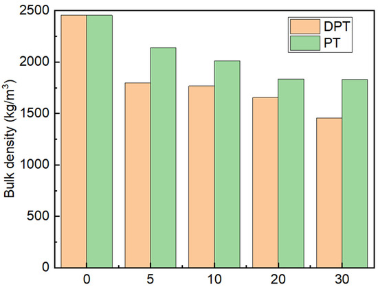 Figure 6 represents the average result of five specimens with standard deviations for DPT and PT of 1.6 and 1.8. The result reveals that by increasing the ash percentage of date palm tree leaves (DPTs) to 5, 10, 20, and 30%, the density of the ceramic specimen decreases from 1797.8, 1768.2, and 1655.5 (kg/) to 1457.7 (kg/) and by increasing the percentage of pine tree ash (PT) to 5, 10, 20, and 30%, the density of the ceramic specimens decreases from 2138.8, 2010.9, 1836.3, and 1829.8 (kg/), respectively. At 0% additives, the dry density is 2454.7 (kg/), the base line (BL) value. When DPT and PT ash is added, during the firing process in which organic component volatilizes create pores, these air-filled pores are significantly lighter than the solid material they replace, which results in a decreasing density. DPT ash causes more reduction in density at higher percentages, likely due to higher organic content. PT ash specimen causes a less steep reduction. As density decreases, ceramic specimens offer various benefits in construction, including diminished structural dead load, improved ease of handling, and reduced transportation expenses.