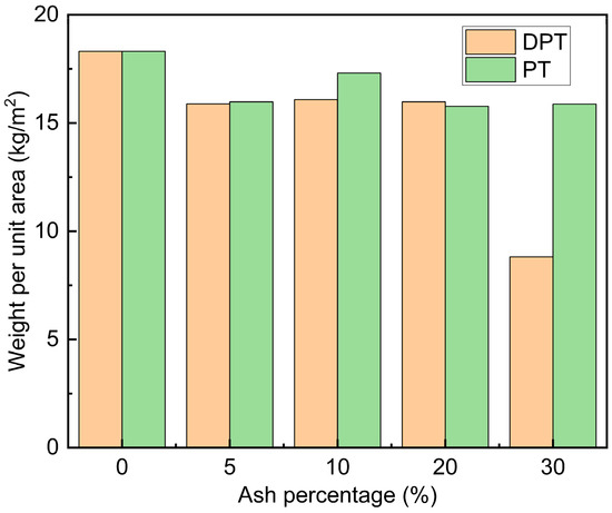 Figure 8 represents the average result of five specimens with a standard deviation for DPT and PT of 1.8 and 1.9. The result shows at 0% addition that the weight per unit area is 18.3 kg/m2, and with the addition of 5 and 10% of DPT leaf ash, the weight per unit area increases from 15.8 and 16 kg/m2 and then decreases at 20% and 30% to 15.9 to 8.8 kg/m2, respectively; with the addition of PT leaf ash at 5 to 10%, the weight per unit area increases from 15.9 to 17.3 kg/m2 and then decreases at 20% to 15.7 kg/m2 and again increases at 30% to 15.8 kg/m2. The minor increase and decrease in PT leaf specimens may indicate unburned residues left during the sintering process. This remaining mineral content compensates for the reduction caused by porosity. However, the fluctuation in weight unit per area remains well within the baseline (0%) specimen limit.