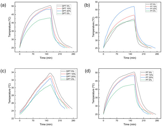 The thermal performance of DPT and PT is depicted in Figure 9. As demonstrated in Figure 9a,b, in comparison with 0% additive, DPT5, DPT10, DPT20 and PT5, PT10, and PT20 demonstrated an obviously higher inner surface temperature during a 160 min heating process, and they also exhibit a higher inner surface temperature during the 75 min cooling process, as demonstrated. These results reveal the energy absorption and release characteristics of the DPT and PT specimens during heating and cooling stages. Figure 9c,d portray the development of inner air temperature within the heating box using DPT and PT. The trends in obtained inner air temperature development resemble those presented in Figure 9a,b. This further validates the endothermic and exothermic characteristics and thermal conductivity performance of ceramic specimens containing additives. Thus, it is concluded that it can be used as heat sink in electronic and aerospace industries.