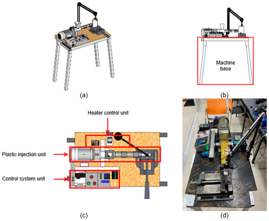 Structure and view of the automatic injection molding machine: (a) three-dimensional model of the machine; (b) front view—machine base; (c) top view—control unit; and (d) actual constructed machine.