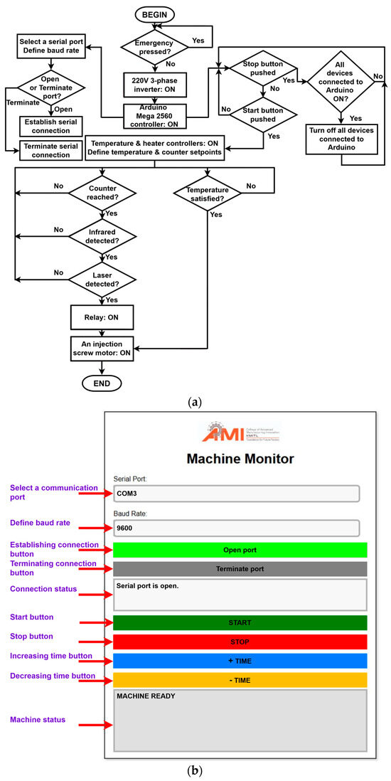 The structural design of the low-cost automatic plastic injection molding machine comprises four primary components (see Figure 1) [31]. These components are the machine base, the control system unit, the plastic injection unit, and the heater control unit. The base is constructed from galvanized steel, with dimensions of 2 × 2 inches for the main structure and 1.50 × 1.50 inches for the four legs, each 84 cm in length. The legs are designed to be foldable for enhanced portability. The tabletop consists of a 1 cm thick hardwood board measuring 80 × 50 cm.