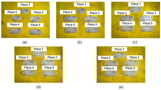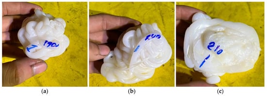 Injection time significantly influenced part quality. For 230 °C, 25–30 s of injection time produced the best results, ensuring complete mold filling. Conversely, 15 s injection times were insufficient, leading to incomplete parts, especially at lower temperatures like 200 °C.