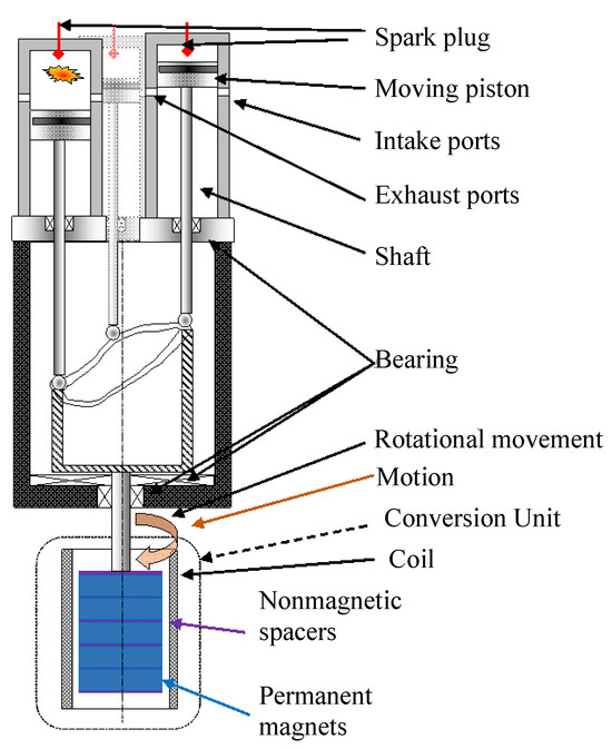 Some concepts of combustion units do not yet comply with the above principles (for example, the crankshaft and inertial masses of the rotational movement of the engine shaft, etc.). Therefore, the development of combustion units is currently turning and focusing on other solutions, as shown in Figure 1, Figure 2, Figure 3 and Figure 4. Classic electric generators based on rotational movement are replaced by linear systems [25], which show higher conversion efficiency due to the reduction in the mass mg of the moving part of the generator and the achievement of higher speeds of movement of the active part of the generator, as can be seen from relation (11).