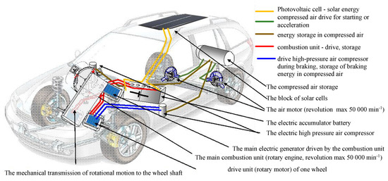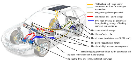 An exemplary selection of energy sources and generators can be seen in Table 1. The choice is then governed by the size of the effective volume density of the performance of technical designs suitable for means of transport, such as a passenger car (Figure 5, Figure 6 and Figure 7). Figure 5, Figure 6 and Figure 7 only indicate conceptual approaches and possible applications of resources, the selection of which depends on several parameters and expected driving characteristics. The choice also depends on the climatic conditions and the weather for which the car is being prepared. A solar cell or a Peltier cell can be used as an alternative aid for recharging electric batteries. The advantages of energy storage in compressed air can be seen in Table 1. Compressed air is easy to use for conversion for vehicle movement, but in the case of the maximum SOC (State of Charge) of electric batteries, these are able to store “redundant” energy by means of an electric high-pressure pump (max pressure p = 7 MPa). The solar cell as a power volume density (convertible to energy) source has lower power volume density (which can be converted into energy) than compressed air, as shown in Table 1. pefd,sol = 4 × 104 W/m3, which is more than other sources (for example, for five orders of magnitude less than in an equivalent volume of organic fuel, pefd,fuel = 4 × 109 W/m3). The solar cell is therefore 100,000 times lower in power volume density pefd,sol, and therefore its use as an additional energy source is recommended. To address the high energy efficiency of all sources and generators used, as shown in Figure 7, it is appropriate to use a control unit programmed to manage the accumulation and consumption of energy in known scenarios of predictable and unpredictable situations and operations during vehicle operation. For example, it is also appropriate to use tools for the recovery of heat generated during vehicle operation and thus increase the efficiency of energy flow utilization. For example, the heat of the combustion unit cooled down in radiator and exhaust gasses is one of these heat sources, possibly additionally cooling the solar panel. The energy collected this way can also be stored in an electric battery or in a compressed air tank.