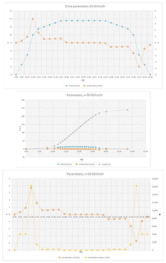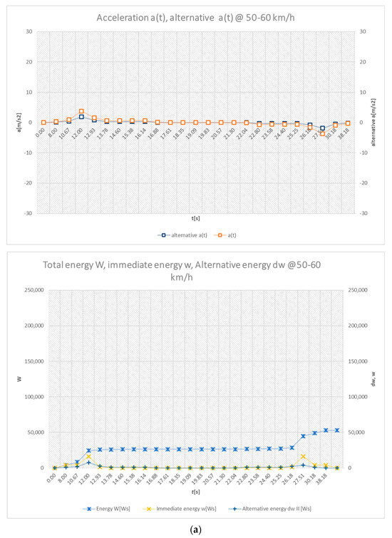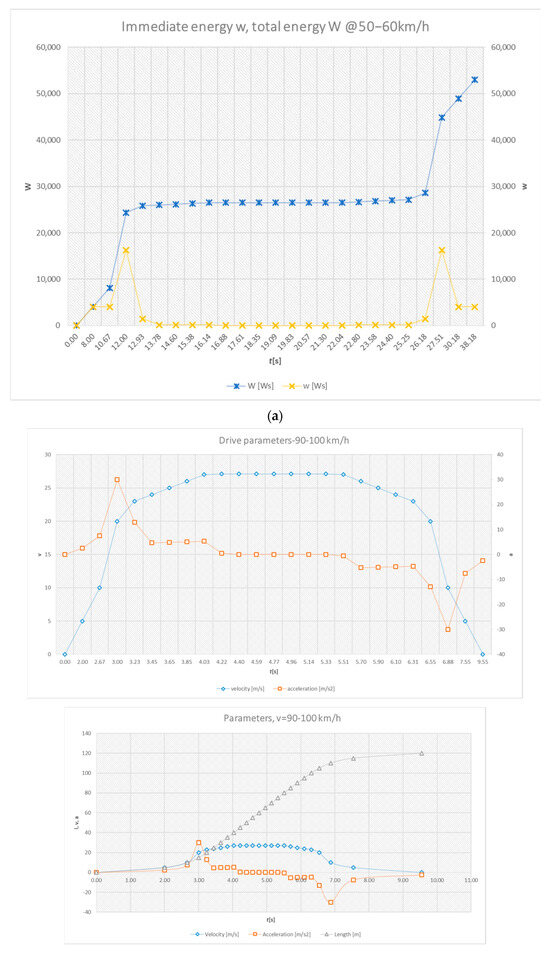 In the case of using only one major energy supply unit, the values of the constant energy consumption and the cumulative energy value are calculated in rows 1 and 2 of Table 2. If we consider the use of alternative sources of accumulated energy to cover approx. 50% of the consumption of the car model while driving, the values of the monitored variables in Table 2 on lines 3 and 4 correspond to this. These data are compared, and a simple conclusion can be drawn. The cumulative energy supply requirements from the main source will be reduced by the corresponding percentage released from other sources. On the other hand, it is necessary to have a reserve for the supply of unexpected energy peaks in real operation. When increasing the replacement of starting and driving energy from alternative energy sources to 90%, the decrease in the load on the majority energy source is again proportional to this percentage. From the dynamic data for the modeled case, it is easy to determine the maximum peak energy and power consumption; for vmax = 50–60 km/h, it is approximately Pmax,60 = 53 kW, while to achieve a speed of vmax = 90–100 km/h while observing the acceleration parameters, etc., it is Pmax,100 = 211 kW, as shown in Figure 10, Figure 11, Figure 12 and Figure 13.