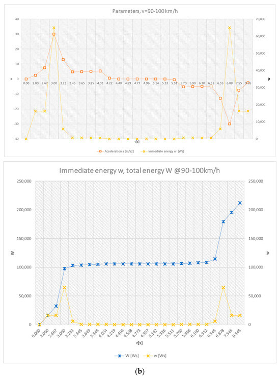(a) The car movement parameters m = 1000 kg, straight section, start, braking, vmax = 50–60 km/h, basic movement dynamics. (b) The car movement parameters m = 1000 kg, straight section, start, braking, vmax = 90–100 km/h, basic movement dynamics.