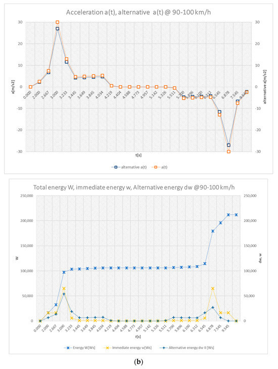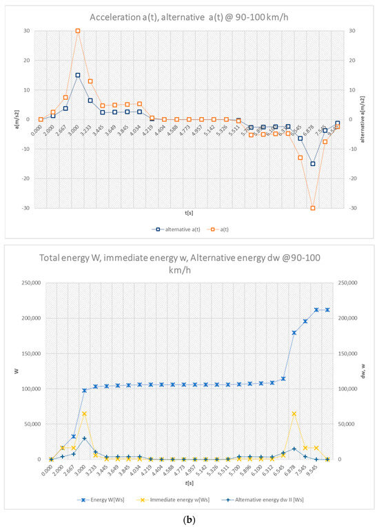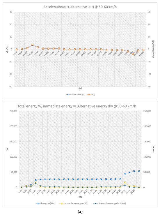 As an example for the application of the second concept, the parameters of a passenger car from the above-described first concept with selected energy sources A-E can be considered. This car model will be considered only when driving on a road due to the simplicity of solving the moving Equation (2) with the consideration of the average smooth surface. The exemplary solution is based on the analysis of the dynamics of the modeled car’s movement and the parameters described by the differential Equation (2). For example, the dynamics of speed, acceleration, and energy needed for starting and braking depend on the parameters of the model example. The graphically interpreted results of a simple solution to the dynamics of the selected vehicle model according to Equation (1) are shown in Figure 8. Vehicle starting/braking and flat driving with respect to friction for two scenarios were considered. The first one is shown with a maximum speed of v = 50–60 km/h achieved in Figure 8a. The second car dynamics model is solved for a maximum speed of v = 90–100 km/h, as show in Figure 8b. The considered choice of speed is based on the established road traffic rules in the village (vmax = 50–60 km/h) and outside the village (vmax = 90–100 km/h), as well as other traffic habits. For the case of covering the peak power Pp requirements (50%) from conventional energy sources (combustion engine) for starting and braking the car, the results are shown in Figure 9. For the maximum use of “alternative” sources (90%) and energy recuperation and accumulation, the parameters and solutions of the equation of the motion of the model are shown in Figure 10.