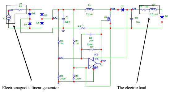 The windings of the coils with turns N1, N2, … N4 of the experimental generator, shown in Figure 11 and Figure 12, are connected in series in one sense of the polarity of the output voltage. The output voltage from the generator is connected to the power control block. The basic element of this block is an electrical circuit operating on the principle of power factor correction (PFC), shown in Figure 13. In segments I, II, III, and IV of the experimental generator, shown in Figure 11, the number of turns of the coil was N1 = N2 = N3 = N4 = 1000 and the linear velocity of the moving part of the generator reached the value v = 4 m/s; the unit was driven by compressed CO2 gas with a pressure p = 100 MPa and mg = 150 g, corresponding to the model from Equations (2)–(11).