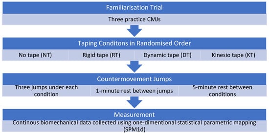 Background: The use of knee taping is widely used to enhance stability and landing performance. However, its impact on jumping performance, a key sports performance determinant, remains unknown. Objective: This study aimed to evaluate the effects of knee taping on continuous biomechanics during the countermovement jump (CMJ). Methods: Nineteen recreational female netball players (age 22 ± 2.69 years; height 167.76 ± 7.47 cm; mass 63.32 ± 10.57 kg) performed CMJs under four taping conditions—no tape (NT), rigid tape (RT), dynamic tape (DT), and kinesio tape (KT). All participants completed all four conditions. Continuous biomechanical data were analysed using one-dimensional statistical parametric mapping (SPM1d) with repeated measures ANOVA (p < 0.05). Results: KT significantly reduced time to take-off (from 2.01 ± 0.67 s with NT to 1.26 ± 0.61 s with KT, p < 0.001) and increased modified reactive strength index (from 0.12 ± 0.05 with NT to 0.21 ± 0.06 with KT, p < 0.001). RT increased braking phase velocity compared to NT (−1.53 ± 0.57 m/s vs. −1.69 ± 0.62 m/s, p = 0.01). SPM1d revealed significant kinematic changes across conditions, including reduced ankle flexion and hip flexion with KT, and increased knee rotation with RT and DT. Conclusions: Knee taping modified joint kinematics without enhancing maximal outputs such as power or jump height. KT improved reactive strength indices, suggesting potential benefits for rapid jump performance, while RT and DT mainly altered joint coordination.