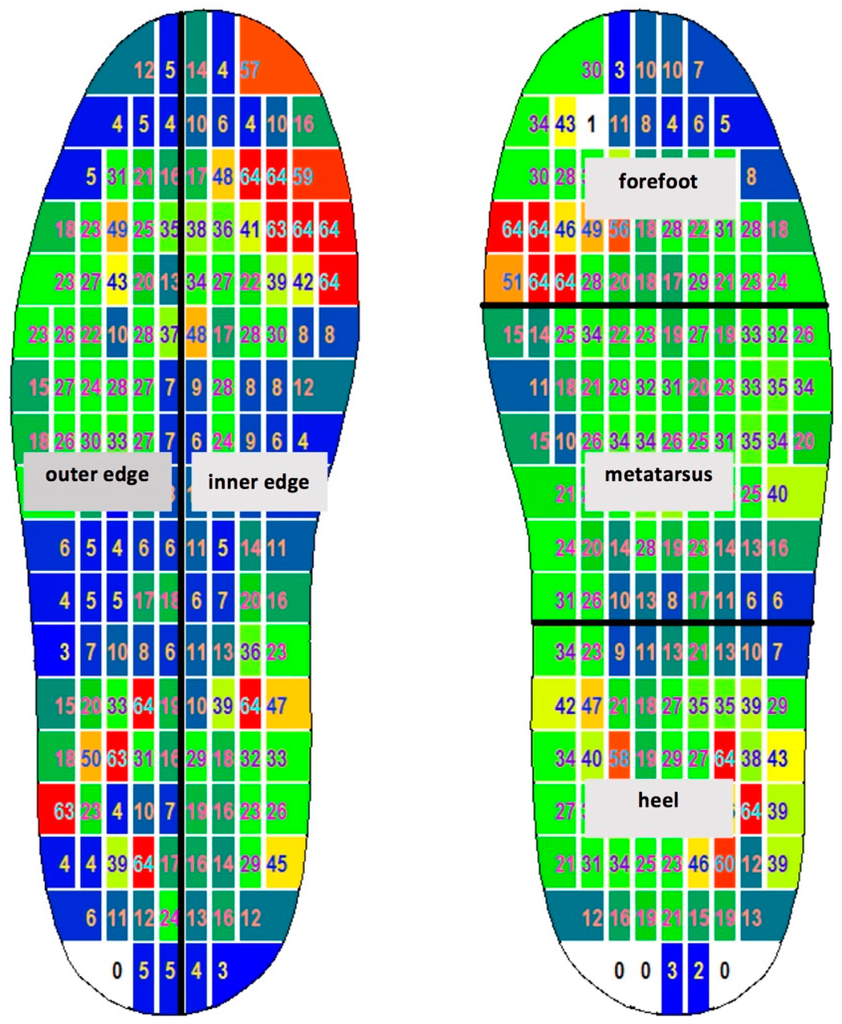 In order to measure changes in pressure distribution on the plantar surface while running with the jogging stroller we used a bilateral insole measurement system (T&T Medilogic, Schönefeld, Germany). The company amounts the measurement error with ±1%. Insoles were provided in different shoe sizes. In order to maintain running comfort, these were positioned above (individual sports specific) insoles if in use. Each insole includes 64 pressure sensors which empower the system to calculate mean pressure results for five foot areas and the whole foot (forefoot, metatarsus, heel, inner edge, outer edge and total; see Figure 1). Furthermore, the double stride length was obtained in order to calculate changes in cadence while running with and without the jogging stroller.