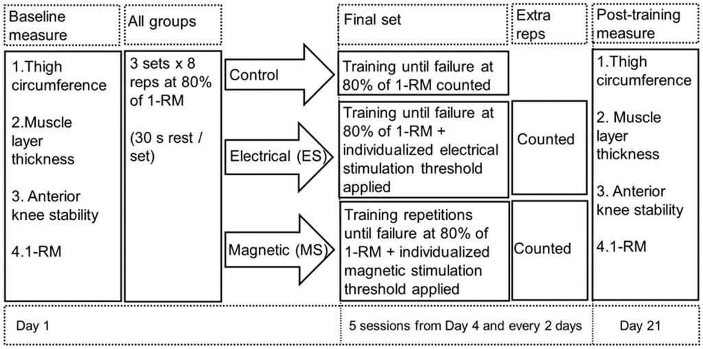We aimed to determine whether peripheral ES and MS applied at the point of muscle failure following voluntary exercise could induce greater hypertrophy, strength and less anterior knee laxity than voluntary muscle activity alone. We hypothesised that a three-week training protocol using peripheral ES or MS applied at the point of voluntary muscle failure would induce more repetitions, and increase thigh circumference, muscle layer thickness, quadriceps strength, whilst decreasing anterior knee laxity compared to the controls.