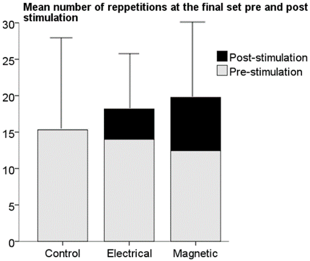 Whilst this was a small study (n = 30), both peripheral stimulation interventions suggested a beneficial trend during strength training by allowing the production of additional repetitions at the point of muscle failure, when it was not possible to continue with voluntary activation alone. In the present study peripherally applied electrical and magnetic stimulation produce similar results, but the electrical stimulation was considered more tolerable than the magnetic stimulation. Furthermore, from a practical point of view electrical stimulation is considerably less expensive with most commercial stimulators having the capability of deliver stimuli simultaneously over two or more channels compared with the single coil for magnetic stimulation.