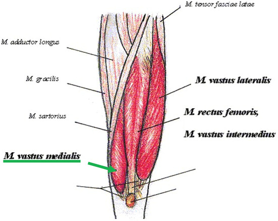 Schematic representations of muscle of thigh with vastus medialis (arrow green). Image by Alfred Grudszus, licensed under CC BY-SA 3.0 and GNU Free Documentation License (GFDL).