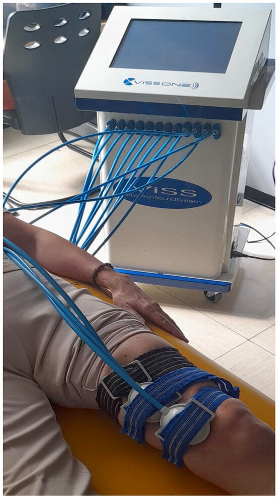 The LMV protocol consisted of the application of local high-intensity vibrations on the homolateral thigh of the PFP knee using the VISS apparatus. The VISS device (Vissman, Rome, Italy) is a tool capable of producing acoustic waves of different frequencies without affecting the set width. The device is not an acoustic wave generator, but rather a flux modulator, and has two components. These is a compressor delivering pressure in the range 0–400 millibar and a modulator producing an oscillatory air flux to create acoustic waves through a two-way rotating valve. The transducer develops a time-modulated sinusoidal wave (300 Hz) [50]. The VISS device is commonly used in musculoskeletal pathology, which, at a frequency of 300 Hz, represents an adequate stimulus for muscle–tendon proprioceptors, muscle spindles, and Golgi tendon organs, can significantly improve muscle strength, decrease muscle tone, disability, and pain [51,52]. During the 30 min of the application of vibrations, subjects were invited to avoid isometric contractions of the treated muscle. The protocol required that three probes producing local mechanoacoustic vibratory stimulation were applied on the skin of the distal part of the quadriceps and on the muscle belly of the Vastus medialis (Figure 1 and Figure 2). The focal vibrations were applied three times a week for three weeks.