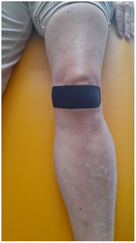 After the LMV protocol, kinesiotaping was applied using the McConnell method (KMcCM) [53], where the patella was manually placed medially and maintained in that position with Tex Tape (Kinesio Holding Corp, Albuquerque, NM, USA) (Figure 3). Specifically, as noted in a recent review, the kinesiotaping technique used for muscles can relieve pain but cannot change patellar alignment, unlike McConnell taping. Both patellar taping techniques are used differently for PFPS patients and substantially improve muscle activity, motor function, and quality of life [25]. All procedures were performed by the same therapist who was blinded to the patients’ data. The therapist who administered the treatments underwent specific training to ensure consistency in both the intensity of the LMV therapy and the kinesiotaping technique. Both interventions were applied strictly according to a pre-defined protocol, which detailed the parameters for LMV settings, taping placement, and the duration of application. To ensure fidelity to the protocol, each session was documented in a clinical diary, recording key details such as LMV intensity and the taping method. The KMcCM was applied three times a week for three weeks. The VAS and KOOS were administered before treatments and at T1 after six months from treatments.