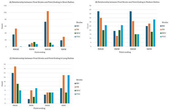 Relationship between point ending and final stroke across different rally types. (A) Relationship between Final Stroke and Point Ending in Short Rallies, (B) Relationship between Final Stroke and Point Ending in Medium Rallies, (C) Relationship between Final Stroke and Point Ending in Long Rallies.