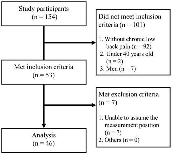 This was a cross-sectional observational study conducted at a community health event held in September 2024, and participants were asked to cooperate in the study. All measurements were performed indoors at a local health facility. The participants were aged ≥40 years; middle-aged and older individuals with CLBP (back pain lasting >3 months) were included in the study as age-related changes become apparent around 40 years of age [21]. Additionally, most of the participants in the health events were women, which limited the scope of this study to women. Exclusion criteria were spondylitis, large disc herniation/severe slip/spinal canal stenosis with obvious neurological symptoms, previous surgery that significantly affected spinal motion, such as spinal fusion, typical physical function impairment, such as paralysis due to cerebrovascular disease, inability to understand the study content due to cognitive impairment, pregnancy, and difficulty in performing the measurement positions in this study (standing without upper limb support, prone, or crawling). Of 154 community health event participants, 46 (age: 67.9 [9.8] years, height: 154.0 [5.2] cm, and weight: 50.6 [9.9] kg) who met the above inclusion criteria and did not meet the exclusion criteria were included (Figure 1).