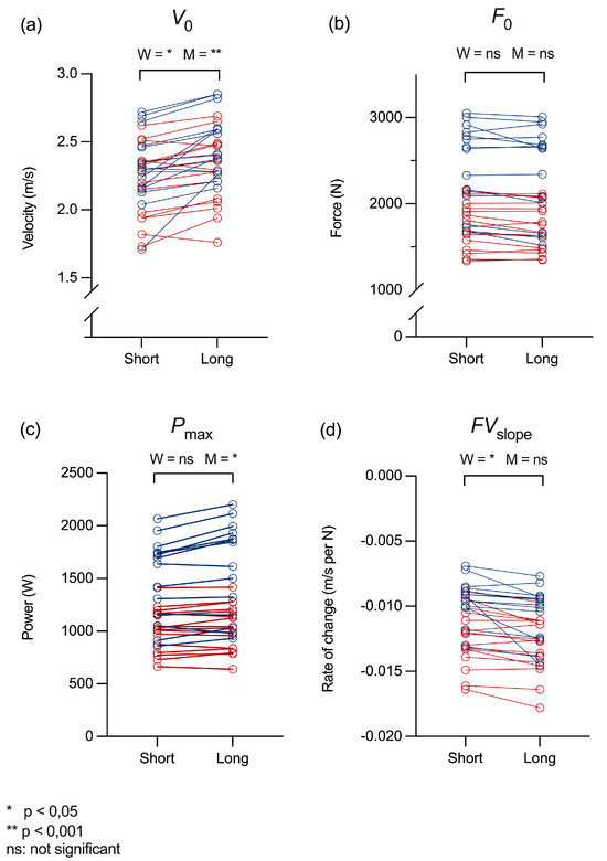 The individual test results for each metric, shown in Figure 1a–d, provide a detailed visualization of participant-level changes and between-subject variability. Figure 1a highlights consistently higher V0 values with long rest intervals across most participants, with a more pronounced increase observed in men compared to women. In contrast, Figure 1b demonstrates similar F0 values regardless of rest condition, indicating the minimal impact of rest interval length on force output. Figure 1c illustrates a clear trend toward higher Pmax with longer rest intervals for both genders; however, the difference is statistically significant only for men. Finally, Figure 1d shows an overall trend of steeper FVslope with longer rest intervals. The change is statistically significant for women, while men exhibited a near-significant trend (approaching, but not reaching, the alpha-level of 0.05). These figures illustrate the range of individual adaptations to different rest interval protocols, complementing the statistical findings reported in Table 4.
