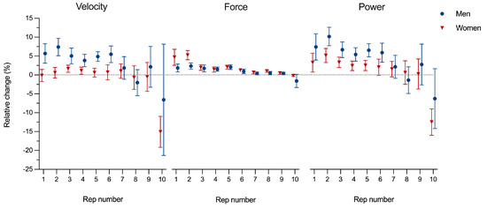 Figure 2 presents the relative changes in performance metrics (velocity, force, and power) from short to long rest intervals during the Keiser 10-rep test. For submaximal repetitions (1–9), men produced notably higher velocities improvements at low to moderate loads, with relative changes ranging from 3.8 to 7.4%, compared to women, who ranged from −0.2% to 1.6%. Except for repetition 1 and 2 for women, force output changes were similar between genders, showing slightly higher but trivial differences across repetitions. Relative changes in power, being a product of force and velocity, showed the greatest changes. As for velocity, the largest relative increase in power for men were observed at repetitions 1 through 6, ranging from 5.4% to 10.1%, while women showed smaller relative increases, ranging from 2.0% to 5.1% over the same repetition range. For maximal-effort attempts (repetition 10), both men and women performed notably worse with longer rest intervals, with considerable variability. Men reduced their velocity by 6.6% and power by 6.3%, whereas women showed sharper declines, with velocity reduced by 15.1% and power by 12.5%.