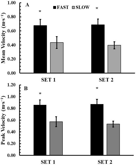 Mean velocity (A) and peak velocity (B) during the conditioning activity (Fast: 2 sets × 6 repetitions and Slow: 2 sets × 3 repetitions). Mean and peak velocity corresponds to the average values of each set. *: p < 0.01 from SLOW.