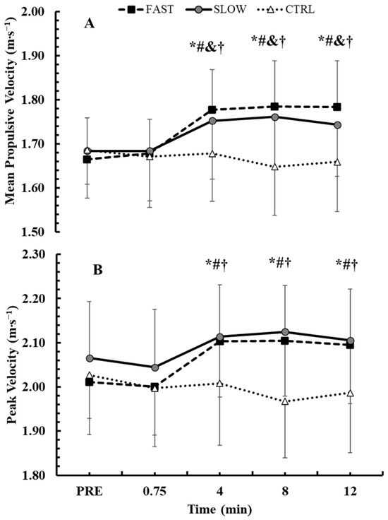 Time course of changes in the BPT mean propulsive velocity (A) and peak velocity (B). *: p < 0.01 from PRE in the FAST condition; &: p < 0.01 from PRE in the SLOW condition; #: p < 0.01 from CTRL at the corresponding time point in the FAST condition; †: p < 0.01 from CTRL at the corresponding time point in the SLOW condition.