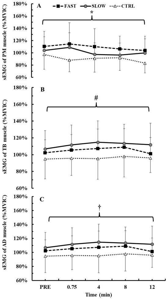 Surface electromyographic activity (sEMG) activity during the bench press throws across the conditions. PM: pectoralis major (A); TB: triceps brachii (B); AD: anterior deltoid (C). Main effect condition. *: p < 0.01 FAST from CTRL; #: p < 0.01 FAST and SLOW from CTRL; †: p < 0.01 SLOW from CTRL.