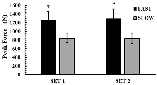 Peak force during the conditioning activity is shown in Figure 7. The 2-way ANOVA (2 conditions × 2 sets) showed a significant interaction for PF (p = 0.037, η2p = 0.37). Tukey’s post hoc tests revealed that PF was significantly higher in the FAST condition compared to the SLOW in both sets (1st SET: 1257.0 ± 203.1 N vs. 840.3 ± 100.7 N, p < 0.001; Hedges’ g = 2.5; 2nd SET: 1293.2 ± 226.7 N vs. 830.8 ± 112.6 N, p < 0.001; Hedges’ g = 2.6).