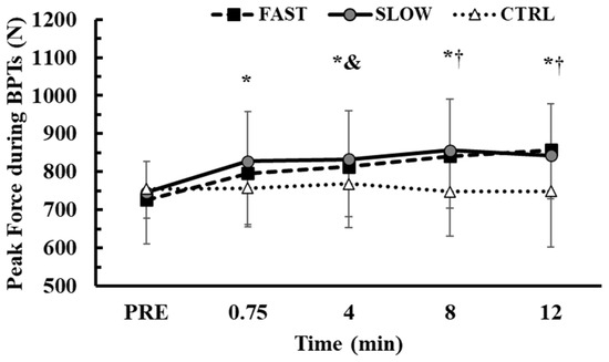 Time course of peak force in the bench press throws across the experimental conditions. *: p < 0.05 from PRE in the FAST and SLOW conditions; &: p < 0.01 from CTRL at the corresponding time point in the SLOW condition; †: p < 0.01 from CTRL at the corresponding time point in the FAST and SLOW conditions.