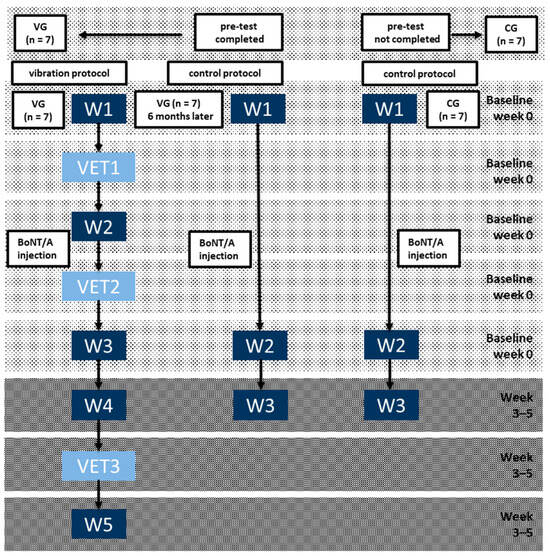 Design of the study. In the first step, pre-test VET was used to separate patients into those who managed to complete the pre-test (VG group; left side) and those who did not complete the pre-test (CG-group; right side). VG patients were first analyzed according to the vibration protocol and, 6 months later, also according to the control protocol. CG-patients were analyzed according to the control protocol only. When patients were investigated according to the vibration protocol (left side), they walked a first time at the baseline visit (W1), received the first VET1, walked a second time (W2), received their routine BoNT/A injection, received a second VET2, and walked a third time (W3). About 3–5 weeks later, they walked again (W4), received a third VET3, and walked a fifth time (W5). When patients were analyzed according to the control protocol (middle part and right side), patients had to walk (W1), receive their routine BoNT/A injection, and had to walk a second time (W2). About 3–5 weeks later, they had to walk a third time (W3).