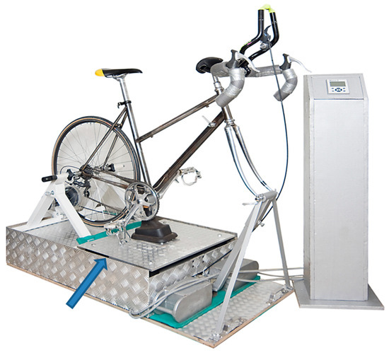 The vibration ergometer consists of a conventional racing bicycle which is tightly mounted on a heavy platform. The bottom bracket is completely decoupled from the crank of the bicycle and firmly fixed to a separate plate which could be vibrated by a strong eccentric motor (see Figure 2; the blue arrow indicates where the plate with the bottom bracket is located). The bottom bracket and rear wheel are connected with a conventional bicycle chain (see Figure 2). Brackets are connected with the rear wheel so that a certain load could be added.