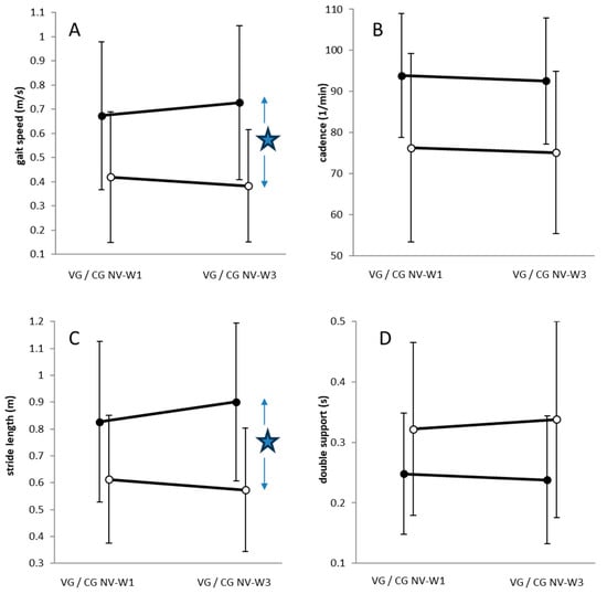 When walking according to the control protocol (W1, W3) was compared between the VG and CG group (mean values and standard deviations are presented in Table 2), VG patients (full symbols in Figure 2) walked with a significantly (p < 0.001) faster gait speed (Figure 2, left upper part), had a significantly higher (p < 0.05) cadence (Figure 2, right upper part), walked with a significantly (p < 0.01) longer stride length (Figure 2, left lower part), and had a significantly (p < 0.05) shorter double support (Figure 2, right lower part) compared to the CG patients (open symbols).