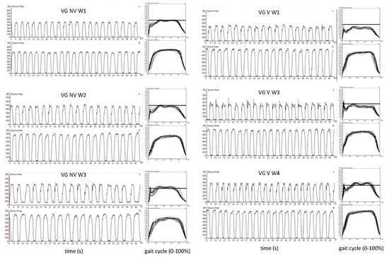 In Figure 4, data of a single subject (V1 of VG) are presented. This 71-year-old male patient was affected on the left side and walked without a cane. The peak GRF curves on the left (L) affected side were much lower than on the less-affected right (R) side. Six different walking conditions are presented from top to bottom: the three walking conditions without vibration, NV-W1, NV-W2, and NV-W3 (left side), and the three walking conditions with vibration, V-W1, V-W3, and V-W4 (right side). For each walking condition, a pair of time segments of original recordings of the GRF curves (left leg (L), upper curve of the pair); right leg (R), lower curve of the pairs) (columns 1 and 3) and the corresponding overlays of all GRF curves of single steps (normalized to step duration) of a recording (columns 2 and 4) are presented. On the ordinate, always the ground reaction force in Newtons (N) is presented. For the sake of comparison, the 500 N level is presented as a horizontal bar for the overlays of the GRF curves of the affected leg.