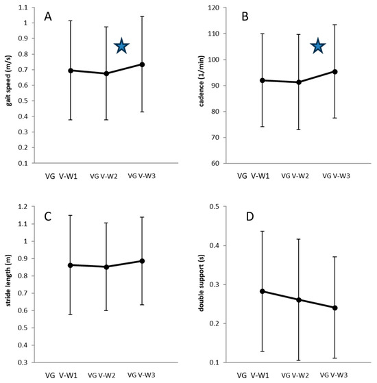 Comparison of mean values and standard deviations (error bars) of 4 gait parameters (gait velocity (A), cadence (B), stride length (C), double support of the affected leg (D) of walking V-W1, walking V-W2 and walking V-W3 in VG patients when walking was analyzed according to the vibration protocol. Gait speed (A) and cadence (B) significantly (p < 0.05) increased after the second VET as indicated by the stars in (A,B).