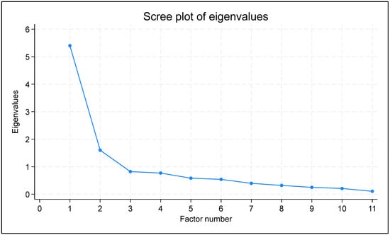 Table 5 reports the results of the inter-item correlation matrix. The KMO statistic was 0.826, Bartlett’s test of sphericity was significant (n < 0.001), and the determinant was 0.001, disproving multicollinearity. The lowest correlation was observed between items 1 and 8 (0.0529), while the highest was found between items 5 and 6 (0.8323). No correlations exceeded 0.9, but numerous were found below the lower threshold (0.3), primarily related to items 8 and 9. Given that the above-mentioned global tests indicated factorability, and that factor analysis was used on an exploratory basis in our research, we decided to proceed with an EFA, accommodating the varying inter-item correlations, through the principal axis factoring (PAF) model [33].