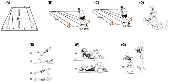 Composition of the fitness assessment test battery: (A) VO2peak; (B) maximal anaerobic capacity; (C) 30 m back-and-forth sprint; (D) flexibility; (E) push-ups; (F) sit-ups; (G) countermovement jump.