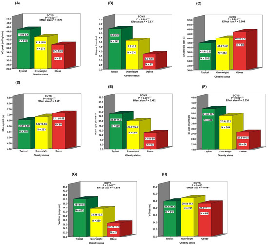 Figure 2 demonstrates that, overall, typical-BMI boys outperformed their overweight and obese counterparts in most fitness tests. This trend was also observed between overweight and obese teenagers. An exception to this tendency was flexibility (V-test), where BMI status appears to have had no significant impact.