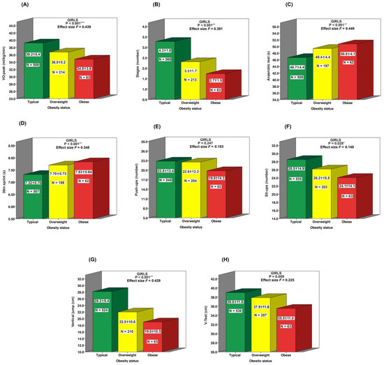In contrast to boys, Figure 3 shows a lack of significant differences between the overweight and obese groups in most fitness assessment tests for girls. However, teenager girls with a typical BMI demonstrated superior physical performance compared to their overweight or obese peers across most physical tests, though this difference was less pronounced than in boys. Notably, performance on the V-test and push-ups appeared unaffected by BMI status among these girls.