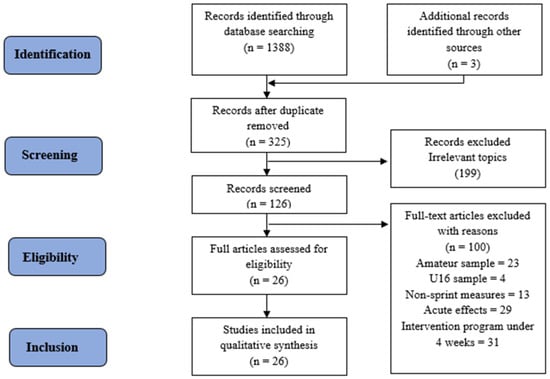 The PRISMA methodology was used, consisting of a 27-item scale [] and a four-phase flowchart (Figure 1). The reviewers MSM and LMMA independently used the search terms to examine the scientific literature through the different selected metasearch engines, such as Pubmed, SPORTdiscus, and MEDLINE. The titles and abstracts of the articles obtained from the initial search were analysed in order to determine the potential articles to be included following the PRISMA flowchart structure (Figure 1). A total of 1388 articles were initially identified through the databases and 3 additional records were found in other sources. After deleting the duplicate articles and carefully reading the abstracts, 199 records were excluded due to irrelevant topics, then 126 were selected for further screening and reading the full text. Then, 100 articles were excluded for not meeting the inclusion/exclusion criteria. Finally, 26 studies were included in qualitative synthesis for this systematic review.