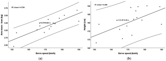 Correlation between the serve speed and lean arm mass or height: (a) lean arm mass and serve speed; (b) height and serve speed.