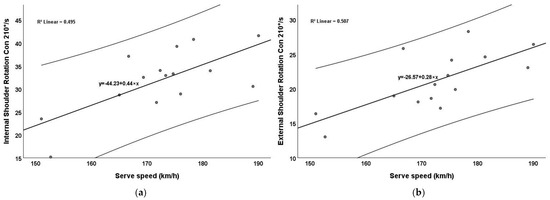 Correlation between the serve speed and shoulder rotation: (a) internal shoulder rotation concentric (210°/s) and serve speed; (b) external shoulder rotation concentric (210°/s) and serve speed.