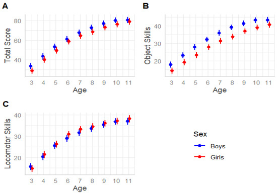 Unconditional models indicated high ICC values explained by between-school variance for the TGMD-3 Total Score (ICC = 0.59), Object Score (ICC = 0.50), and Locomotor Score (ICC = 0.54), demonstrating the need for a multilevel approach. LMM results indicated an interaction between Sex and Age group in the Total Score (F(8, 16438) = 2.45, p = 0.011), Object Score (F(8, 16438) = 3.49, p < 0.001), and Locomotor Score (F(8, 16438) = 5.61, p < 0.001). Boys showed significantly higher Total Scores compared to girls at all ages (all p < 0.001) except at age 11 (p = 0.940), and in the Object Score at all ages (all p < 0.05). In the Locomotor Score, boys and girls showed similar performance overall (all p > 0.05), but girls had higher scores than boys at ages 6 (p < 0.001), 7 (p < 0.001), and 8 (p = 0.004). Results are summarised in Table 1 and Figure 1. BMI was found to be a significant covariate for the Total Score (F(1, 16445) = 547.95, p < 0.001), Object Score (F(1, 16445) = 286.52, p < 0.001), and Locomotor Score (F(1, 16445) = 461.58, p < 0.001), all showing negative relationships. Specifically, higher BMI was associated with lower scores in the Total Score (b = −0.62, SE = 0.002, t = −23.40, p < 0.001), Object Score (b = −0.29, SE = 0.001, t = −16.92, p < 0.001), and Locomotor Score (b = −0.34, SE = 0.001, t = −21.48, p < 0.001).