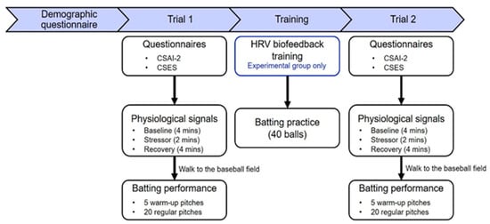 Based on previous studies [7,10] and considering the concentrated nature of university baseball seasons, this study adopted the training protocol proposed by [10] while incorporating the HRVB procedures outlined in [7]. In light of the discrepant psychological findings reported in [7], this study aimed to further investigate the effects of HRVB training on anxiety reduction and batting performance in baseball players. Therefore, two hypotheses were formed: (1) HRVB training will reduce anxiety in baseball batters; and (2) HRVB training will improve batting performance in baseball batters. In the following sections, the experimental procedures and analysis methods are detailed, the results of the conducted experiment are presented, and the effects of HRVB from various perspectives are discussed. Finally, a conclusion is given.