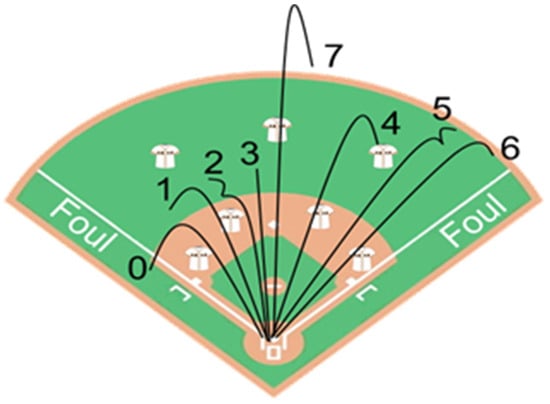 The final part was measurement of batting performance. A pitching machine was used to pitch at 120 km/h, with each participant given 5 warm-up pitches and 20 regular pitches, and a pre-determined point system designed by Strack [7] was used to score and record each ball hit (Figure 2). Additionally, a swing analyzer (Baseball Swing Analyzer, Blast Motion, Inc., San Marcos, CA, USA) was mounted on the end of baseball bat, in order to record the bat speed (miles per hour, MPH), peak hand speed (MPH), and other parameters.