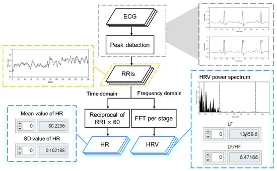The signal processing flow of the ECG signals is shown in Figure 3. ECG signals were used as input to the LabVIEW programming system, which detected the R-peak and calculated the R-R intervals (RRIs). Analysis of RRIs was divided into time domain and frequency domain, where time domain analysis was conducted to calculate the reciprocal of RRIs and obtain the mean and standard deviation of the HR. Spectral analysis of HRV was carried out using a fast Fourier transform (FFT), after which the HRV indices were calculated.