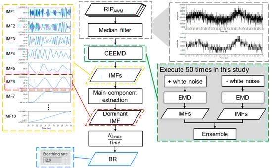 The present study used the LabVIEW programming system to process RIP signals [17], and the processing flow is shown in Figure 4. First, a digital median filter with value 2 for left and right ranks was used to reduce noise from the abdominal wall movement (AWM) signal. Second, the signals were decomposed into several intrinsic mode functions (IMFs) using complementary ensemble empirical mode decomposition (CEEMD) [18]. The IMF with the highest energy density was chosen as the dominant component, and the BR was calculated.
