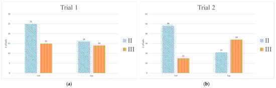 Number of balls in categories II and III in each group: (a) trial 1; (b) trial 2.